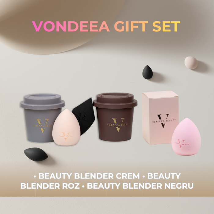 Vondeea Gift Set 15 este un set format din 3 bureței profesionali: buretele crem, buretele roz și buretele negru. Ideali pentru aplicarea fondului de ten, anticearcănului și produselor cremoase, oferind un finish natural, uniform și fără urme.