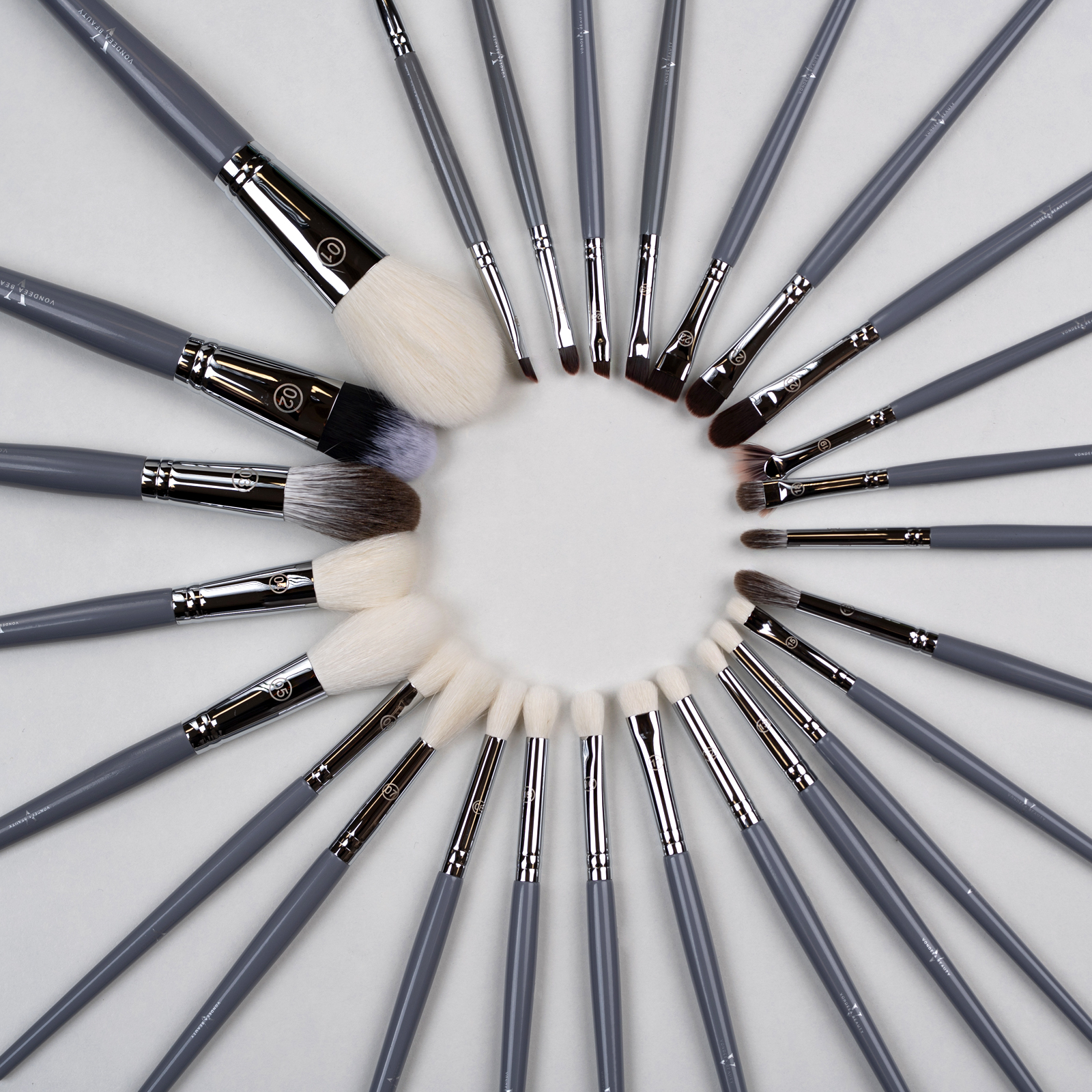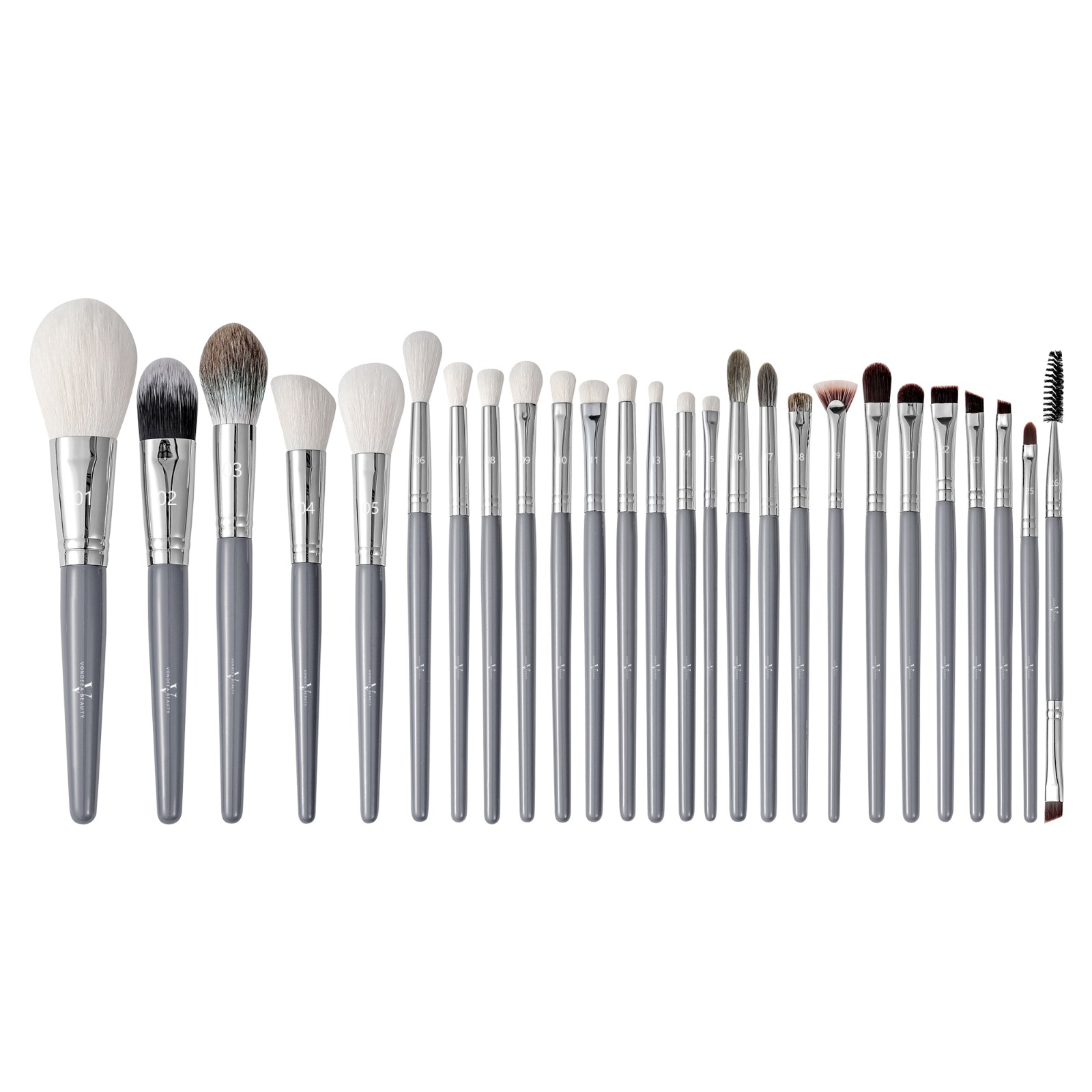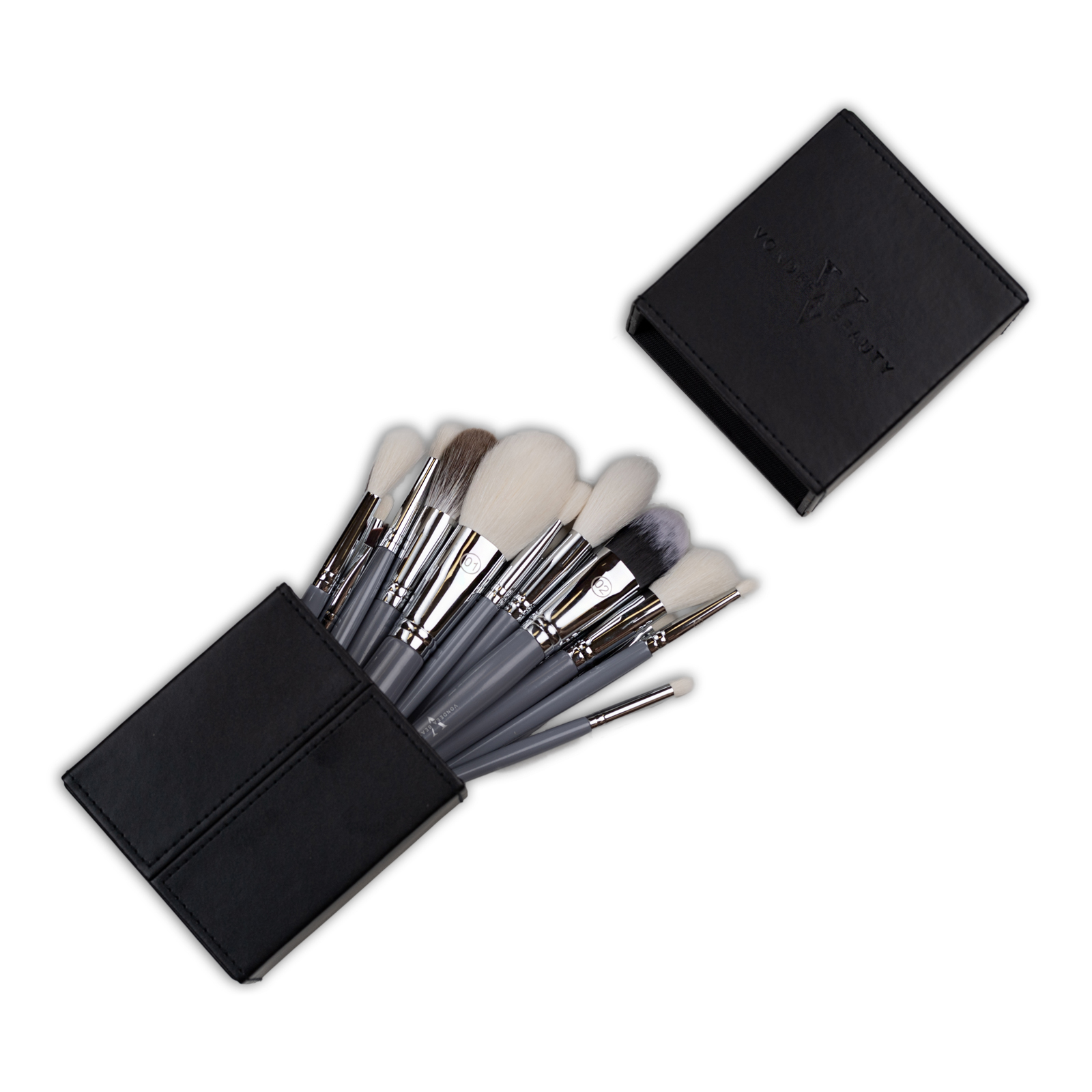 Colecție completă de pensule pentru față, ochi și buze, realizate manual din păr natural de capră, păr de vulpe siberiană și fibre Taklon sintetice. Cu mânere gri perlat și etui negru inclus, este alegerea ideală pentru makeup artiști.